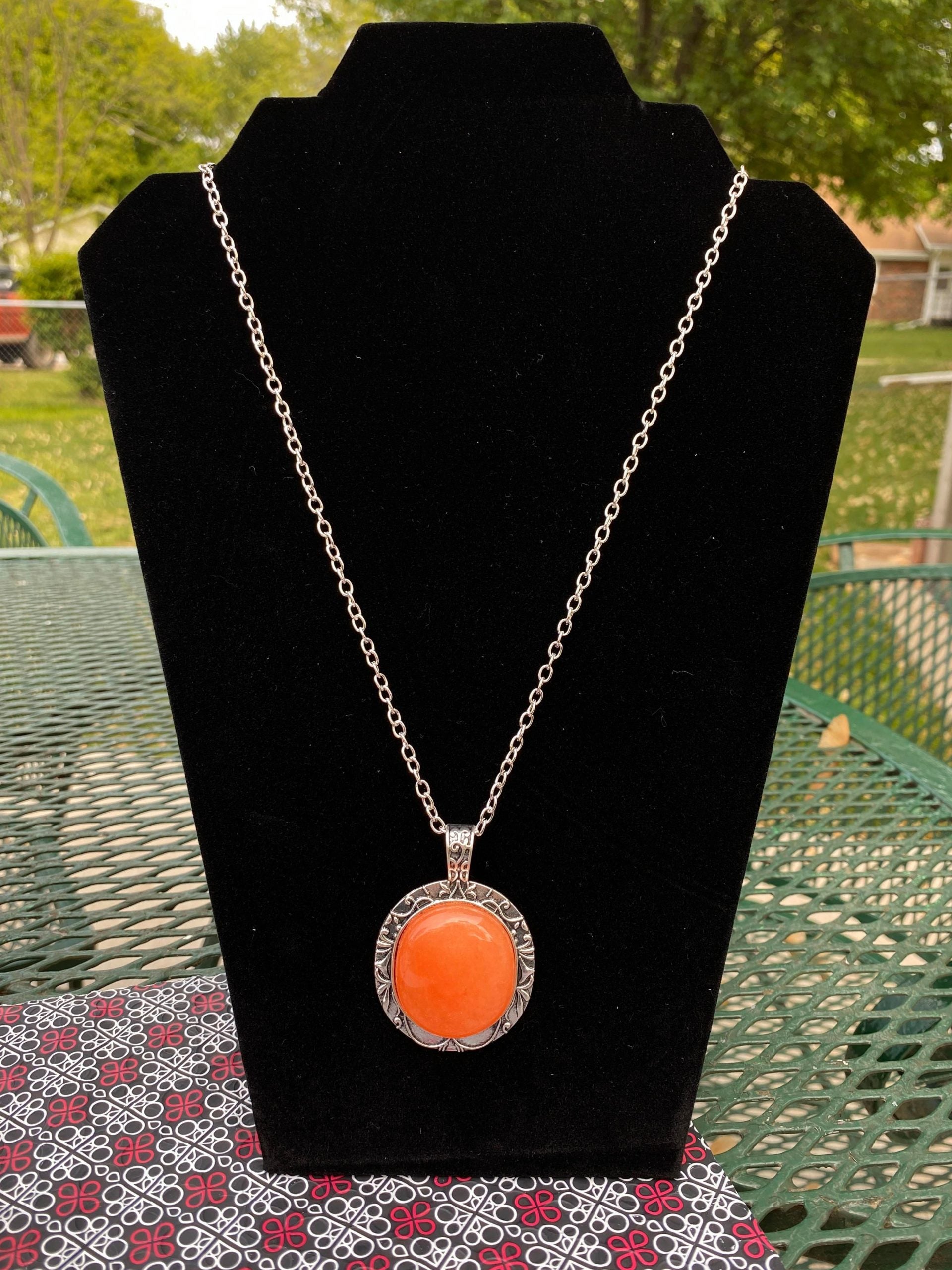 An orange stone is pressed into the center of an ornate silver frame embossed in a leafy filigree pattern. The whimsical pendant swings from the bottom of a lengthened silver chain for a season finish. Features an adjustable clasp closure.