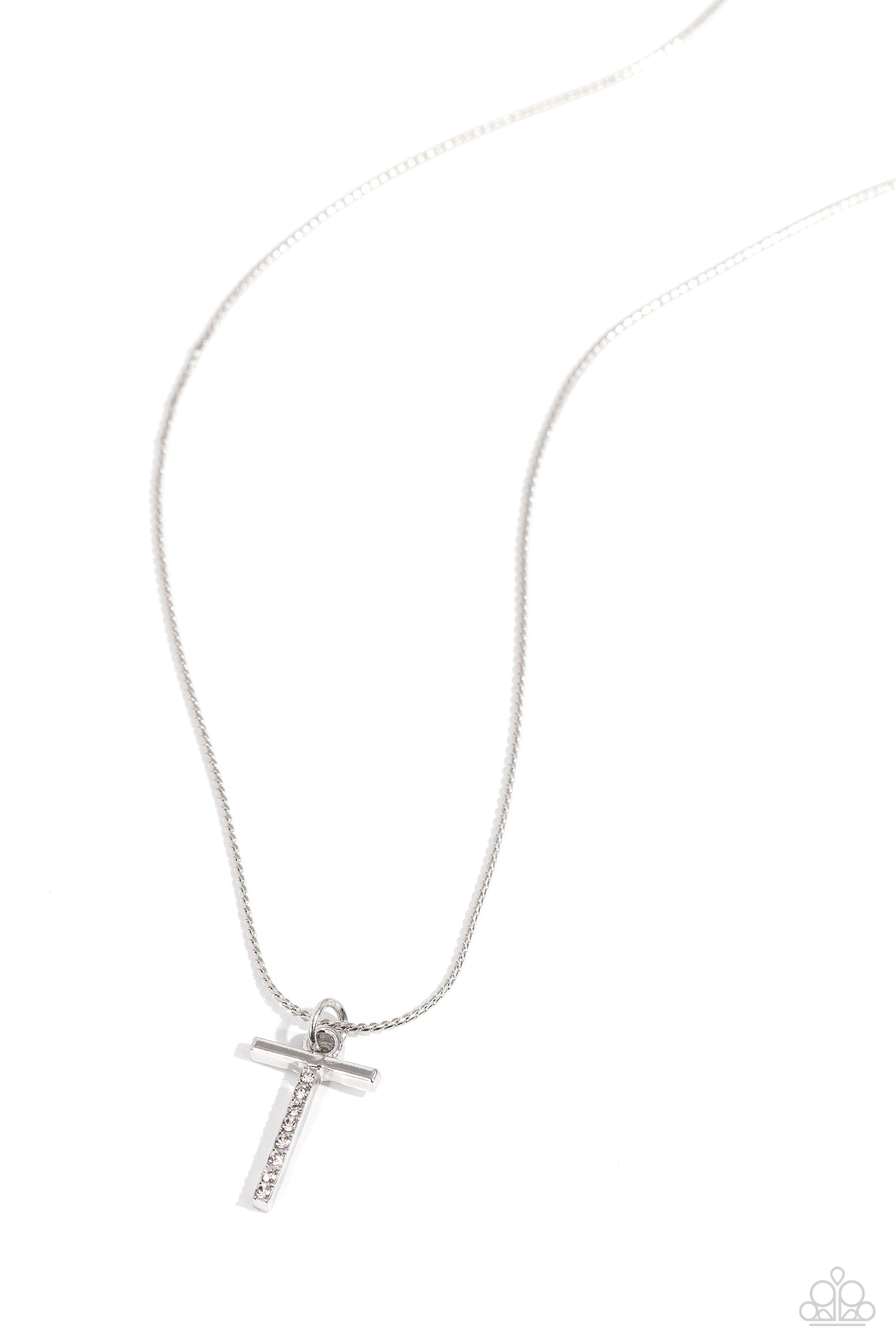 A row of glistening white rhinestones encrusts along one side of a silver letter "T" hovering below the collar from a dainty silver chain for a sentimentally simple design. Features an adjustable clasp closure.