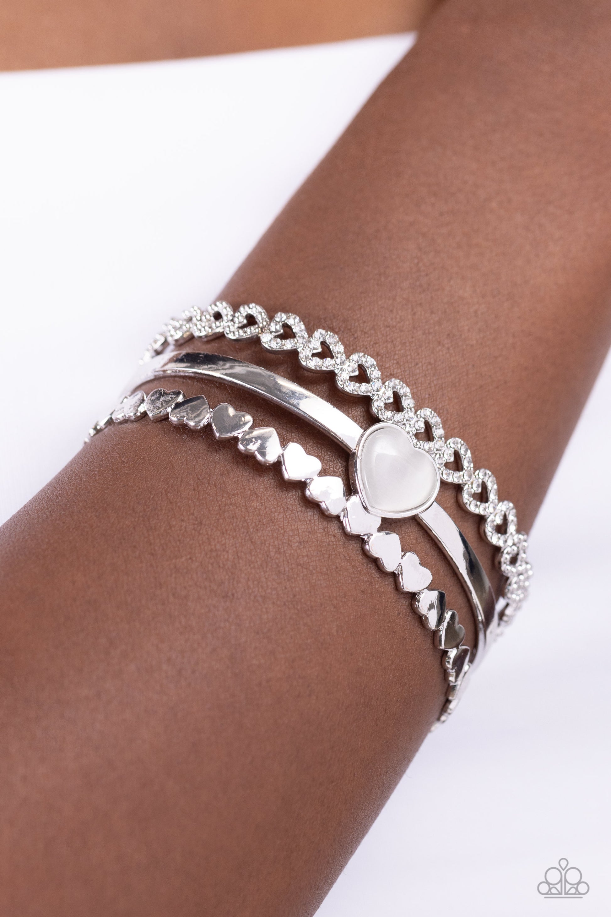 Three bands of silver arc across the wrist to create a romantic-inspired cuff. A row of white rhinestone-studded hearts are turned on their sides, gracing the top band of the cuff while solid silver hearts alternate end-over-end to create the bottom band. A sleek bar of silver topped with a white, heart-shaped, cat's eye stone falls between the outer bands, emerging as a polished focal point in a whimsical finish.
